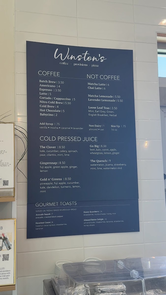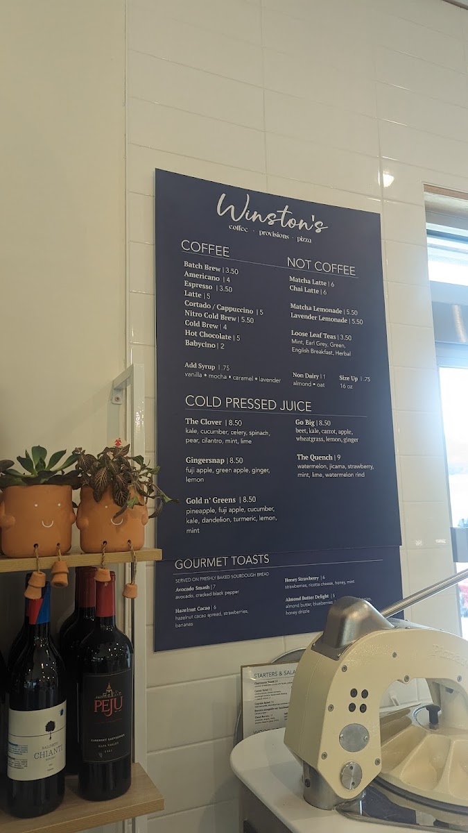 Welcome to Winston's: coffee + provisions + pizza, a delightful cafe nestled in Spicewood, TX, where culinary simplicity meets quality. The menu showcases an impressive array of coffee and tea options, including the seasonal Strawberry Matcha Latte and Lavender Lemonade, perfect for quenching your thirst. For a small bite, the Italian Sausage Burrata pairs beautifully with their handmade pizza dough, while the Charcuterie Board is an artistically crafted shareable delight.